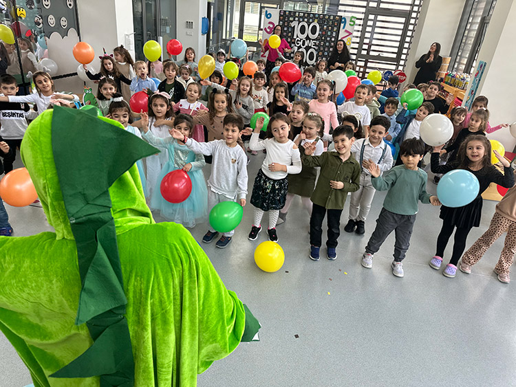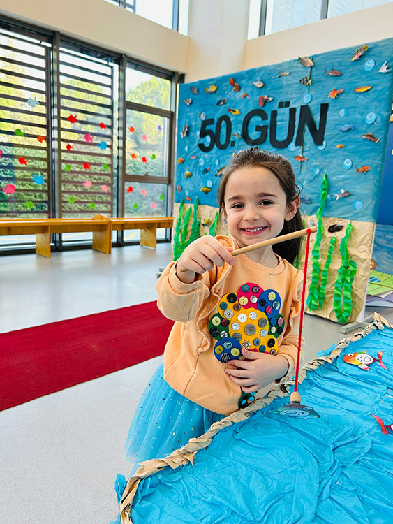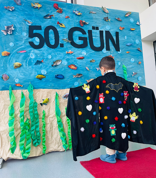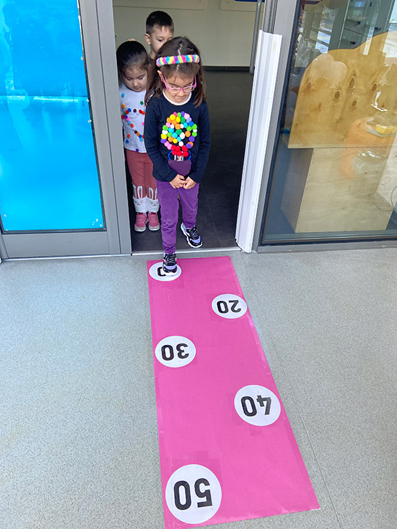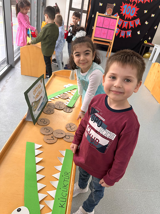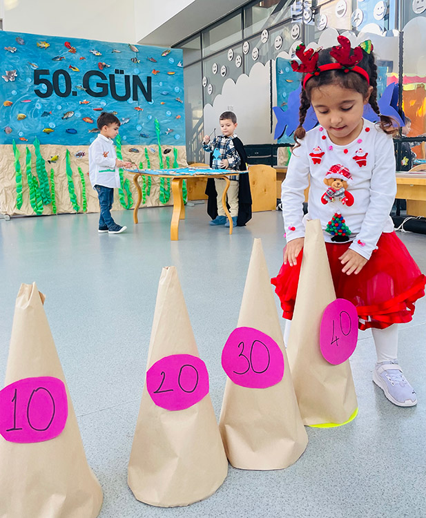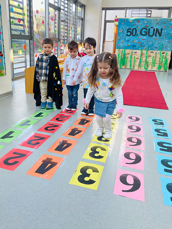 Bu çalışma öğrenciler ile ritmik sayma davranışını geliştirmek ve zamanla ilgili olarak dün-bugün-yarın kavramını öğrenmelerini desteklemek için her gün uygulamaktadır. 50. ve 100. Güne sayarak gelen yaş grupları ile okulumuzda eğitici oyunlar eğlenceli şekilde çocuklara uygulanmaktadır.